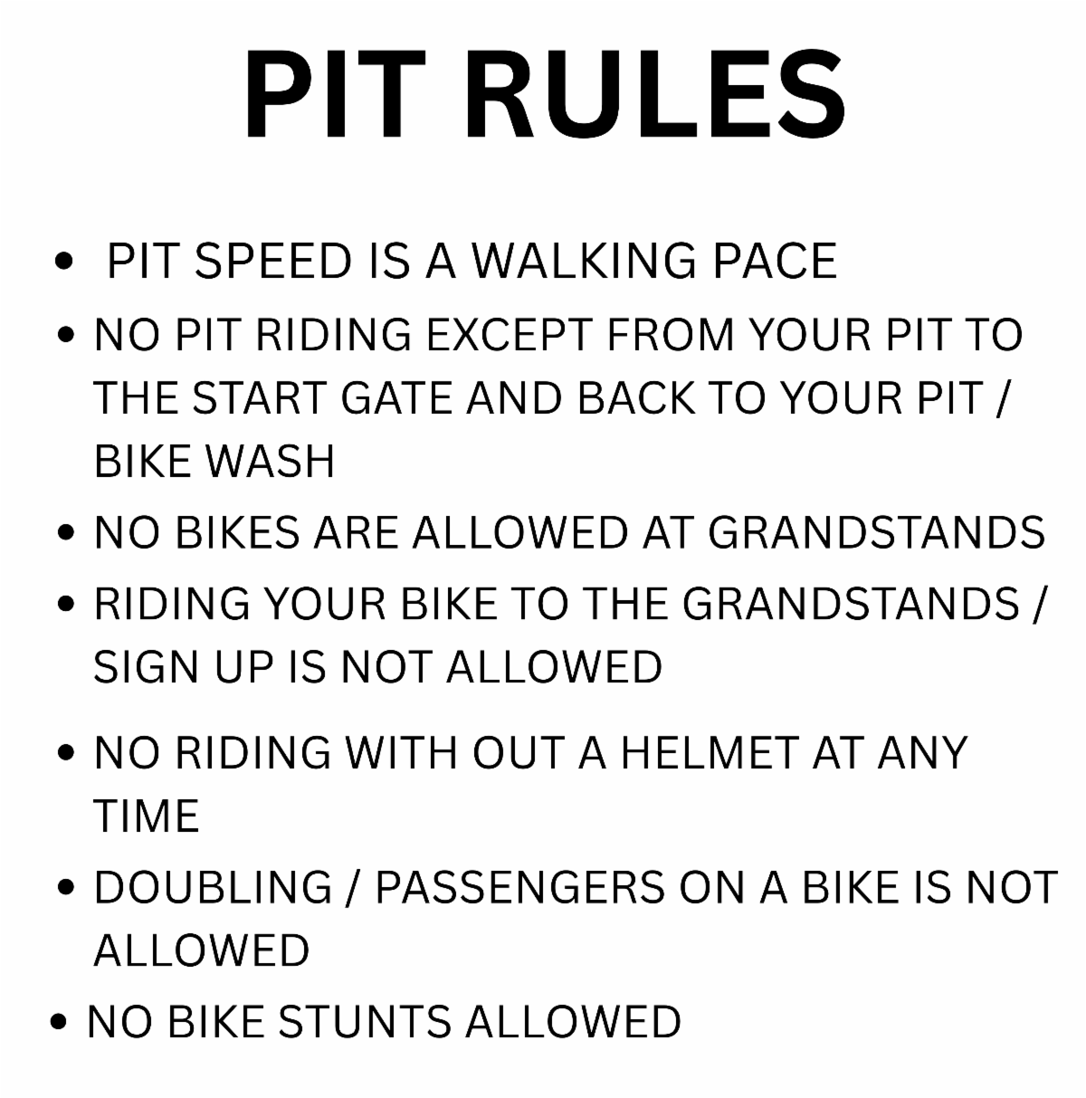 50cc Riders? In order to be on the track - parent(s) must have a mechanics band. You are physically on the track assisting your child. No wristband, you won’t be allowed on the starting line or track.